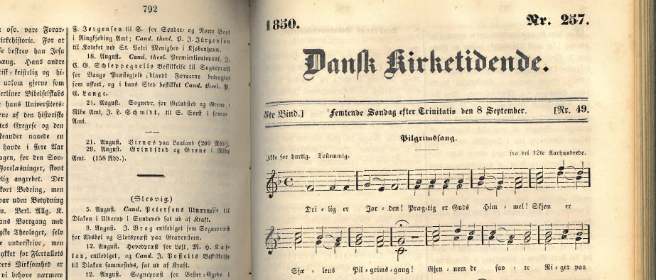 - Et Par smaa religiøse Sange, som jeg i den sidste Tid har skrevet, vil De finde i dansk Kirketidende – en Pilgrimssang og en Julesang, hvortil Musikken, to gamle meget smukke Melodier, tillige er meddelt. I dem begge er det det Glædelige i Christendomsbevidstheden, som er fremhævet.