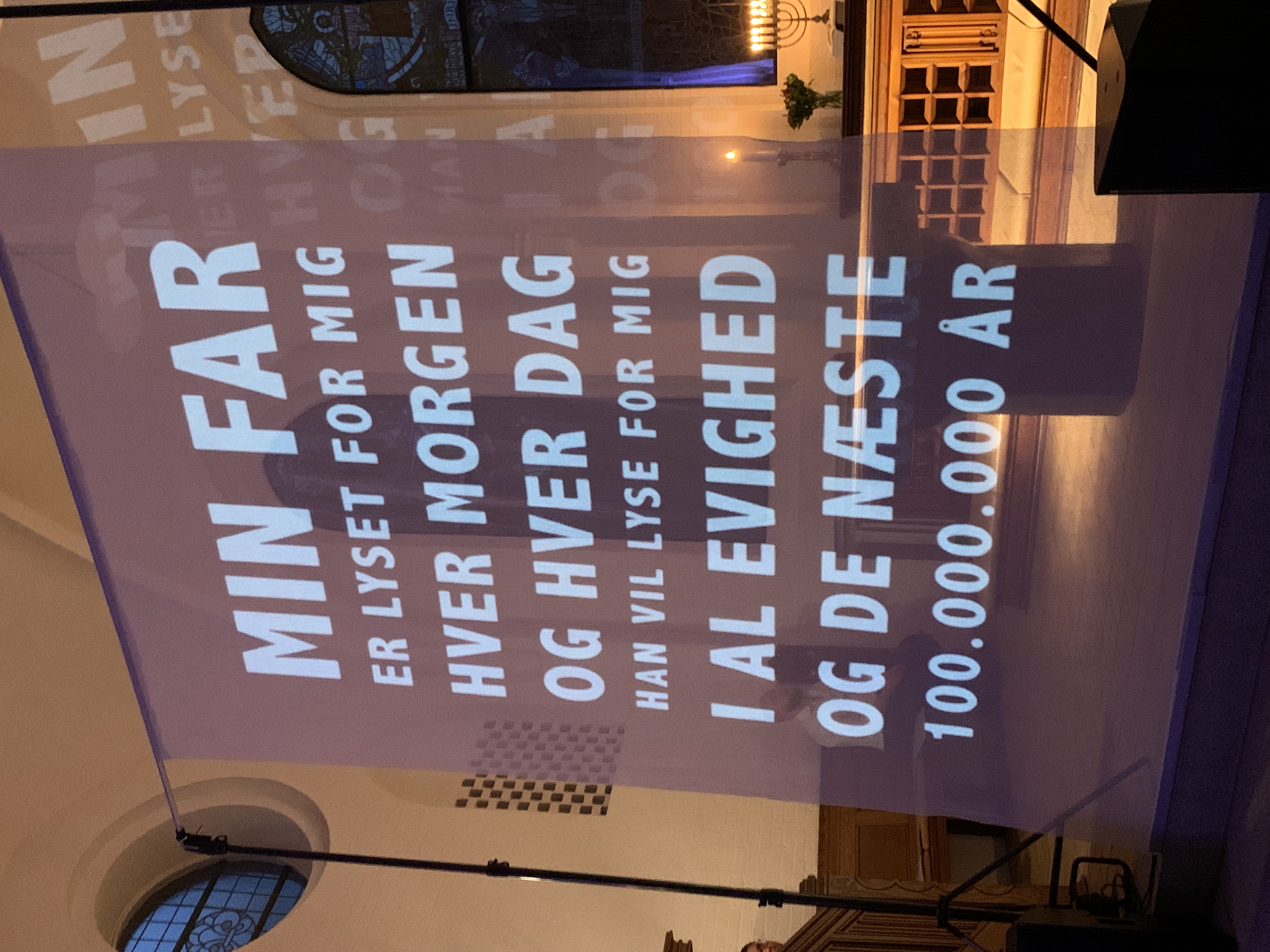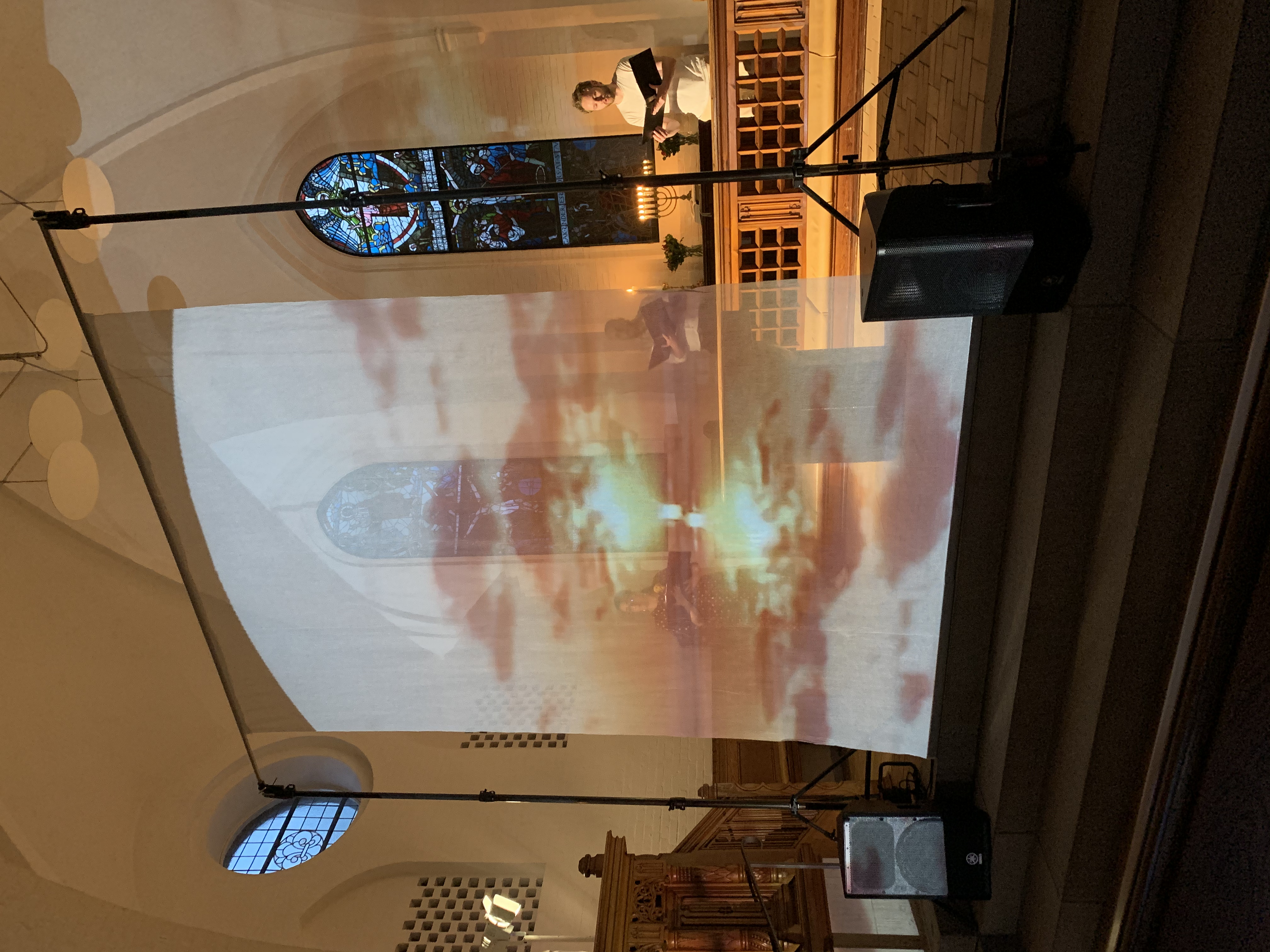 Projektet var færdigt før jul, men så lukkede konfirmandforberedelsen ned og kyndelmisse blev aflyst. Derfor endte det hele med at blive udsat og forvandlet til en ’lyse nætter-gudstjeneste’: to aftener, fredag og lørdag i juni kl.22.15-22.45! Mørket var nødvendigt for videoinstallationerne i kirkerummet og de tilstødende lokaler.