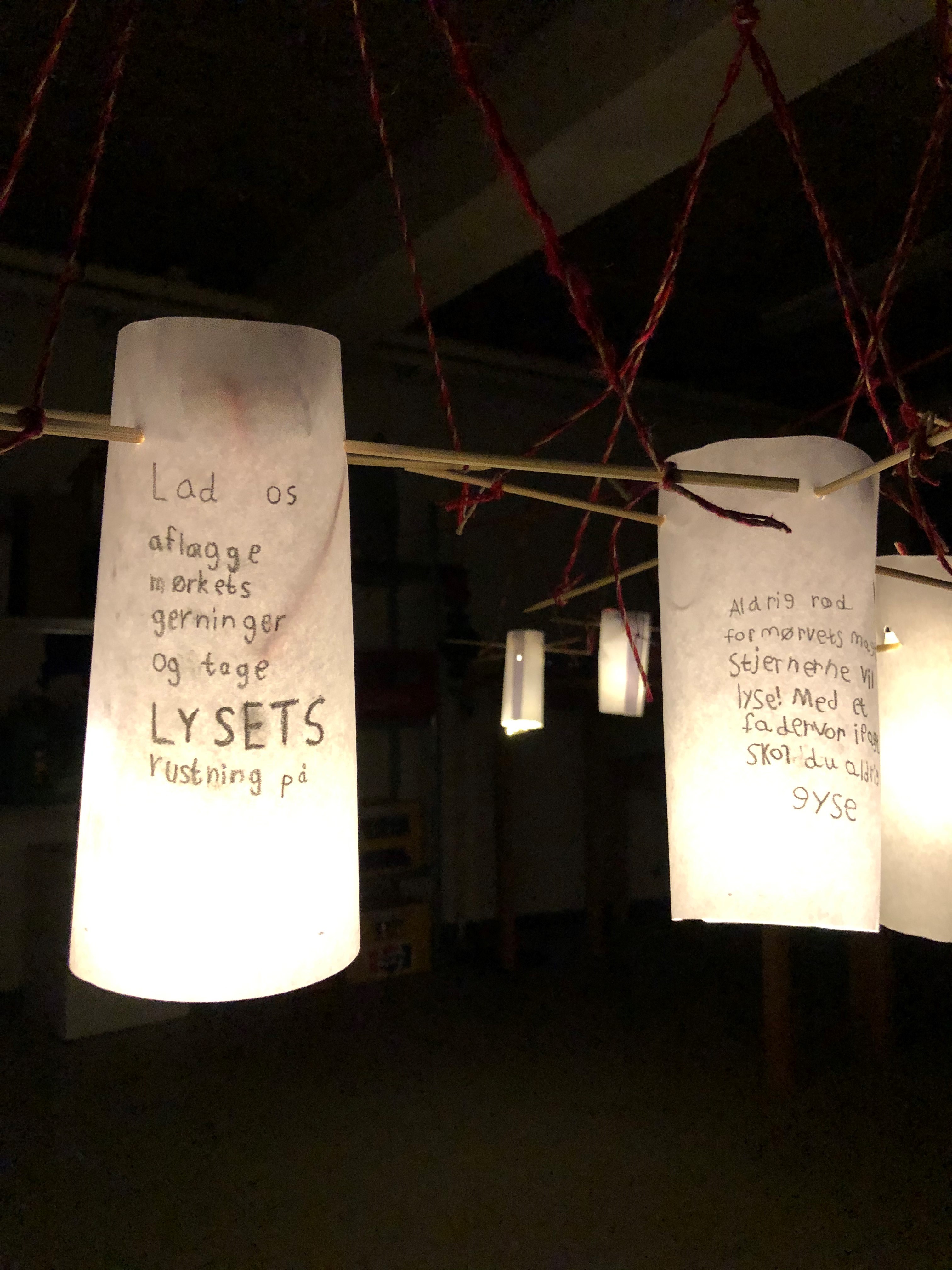 Sammen med kunstneren Tine Kortermand havde vi sat tre lektioner (a 1 ½ time) af til workshops. Her udfærdigede konfirmanderne deres ord om lyset i naturen, om den, der 'er lys for dig', og fremstillede lygterne, hvor de havde udvalgt et citat fra et salmevers, omhandlende lys og mørke.