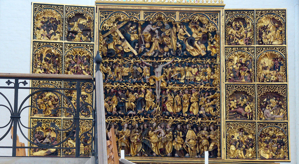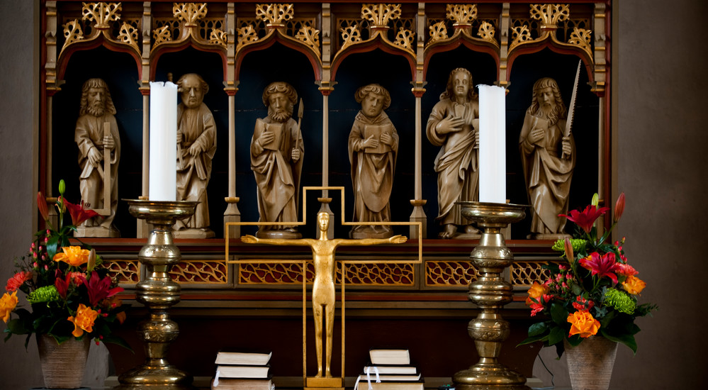 Tusind år gammel kunst udsmykker de vægge, der danner rammen om nogle af livets vigtigste begivenheder i folkekirken. Her ses altertavlen i Vejlby Kirke ved Aarhus. Ni af figurerne i tavlen er sen-gotiske og stammer fra slutningen af 1400, imens tre af figurerne er barokke og stammer fra omkring 1660. Tavlen blev opsat, da kirken blev istandsat i 1738.