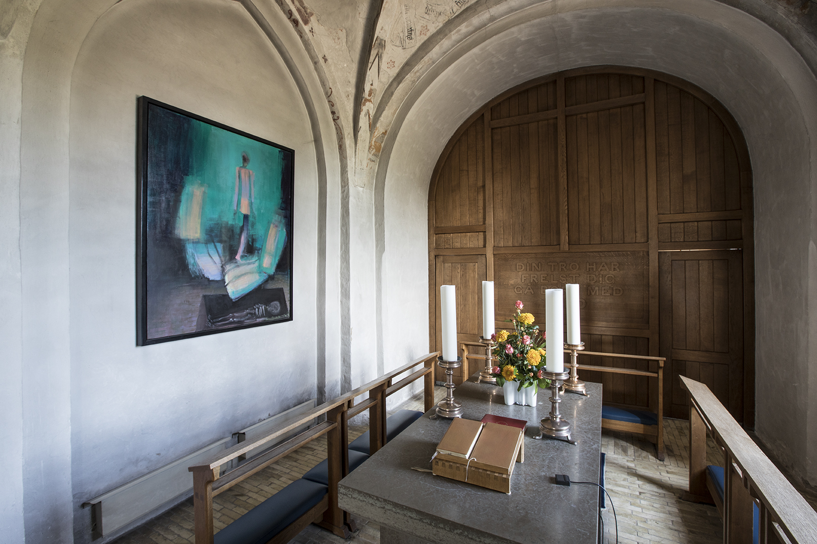 Huset bærer derfor præg af at have stået der i mange generationer: Kirken er fra cirka 1150, døbefonten fra 1300-tallet. Over det moderne kor hvælver sig kalkmalerier uden den store æstetisk værdi, bortset fra at være et postkort fra 1400-tallet. Kirkeskibet (det store kirkerum, red.) er et renæssancerum med smukt udskåret træværk i prædikestolen og med stolestader i træ foran et ret nøgternt udtryk i orglet, der er bygget, så man får glæde af vestvinduet. Men der mangler en arkitektonisk og æstetisk sammenhæng. Menighedsrådet arbejder på den, skulle jeg hilse og sige.